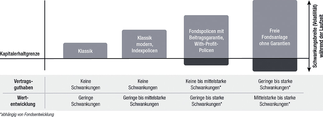 • Modernisierte Formen der klassischen Kapitalanlage: Kapitalanlagearten mit reduzierten Garantien und erhöhter Überschussbeteiligung oder mit Indexpartizipation (Indexpolicen).
